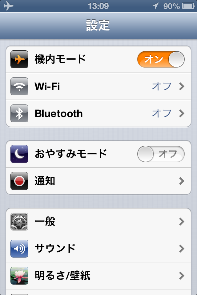 「設定」から「機内モード」を「オン」にします。これですべての電波の発信を停止しているはずです。