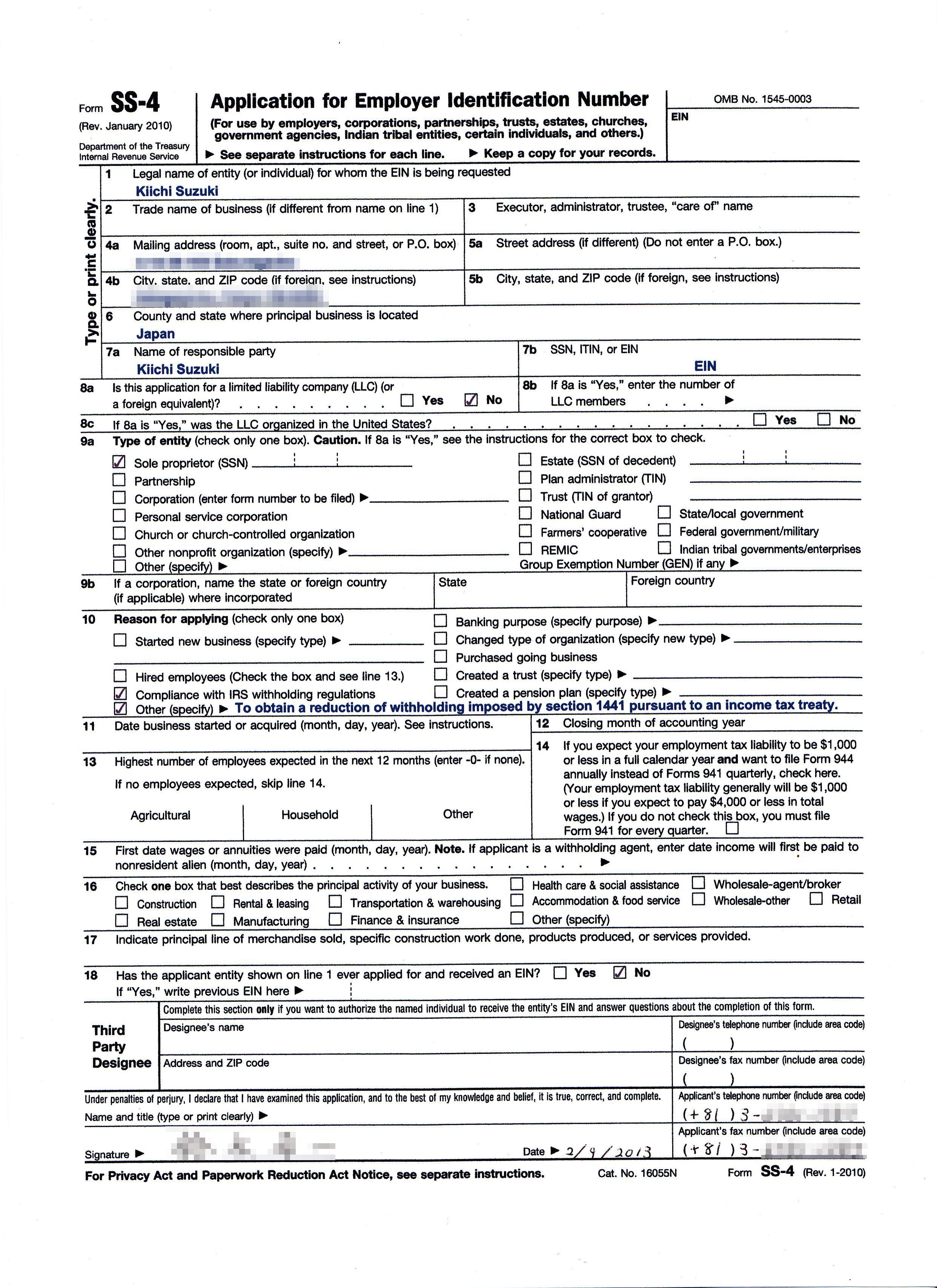 記入例で説明されていない項目もありますので、個人出版で申請する場合の、フォームSS-4(Rev. January 2010)の書き方について解説します。将来、書式が変更になる可能性がありますので、ご承知おきください。