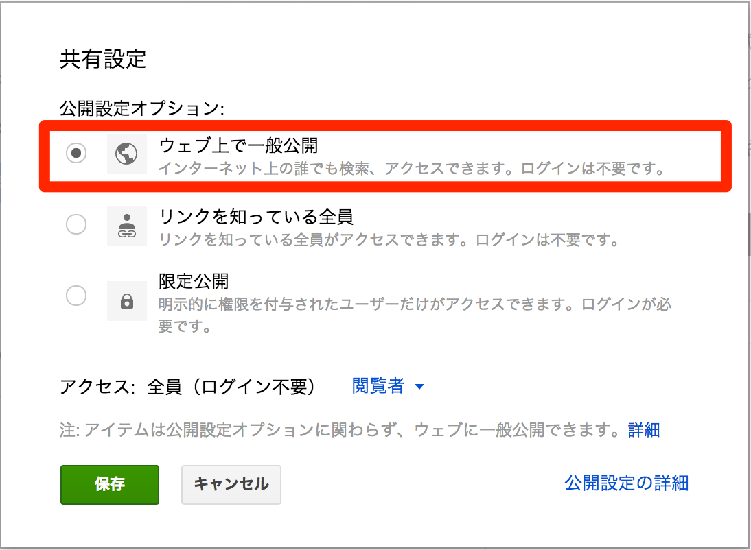 「ウェブ上で一般公開」にチェックし、「保存」をクリックします。