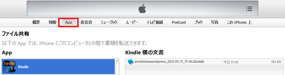 (2)「App」タブの「ファイル共有」からKindleアプリを選択します。