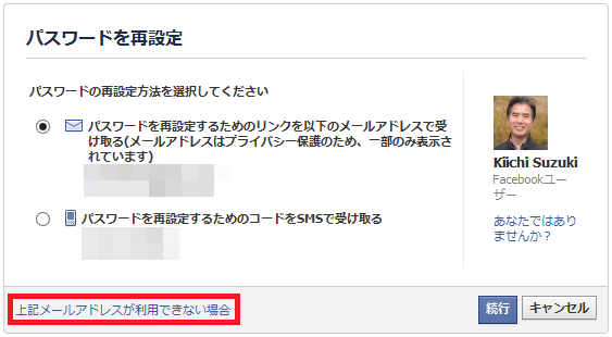 (3)登録メールアドレスを入力すると「パスワードを再設定」のダイアログになります。ここで「上記メールアドレスが利用できない場合」をクリックします。