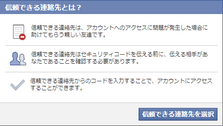 ただし、「信頼できる連絡先」に登録したことは、相手先にその連絡が行くようです。また、Facebookが乗っ取られて使えないときの連絡ですから、Facebook以外の連絡手段がなければ、登録する意味がありません。
