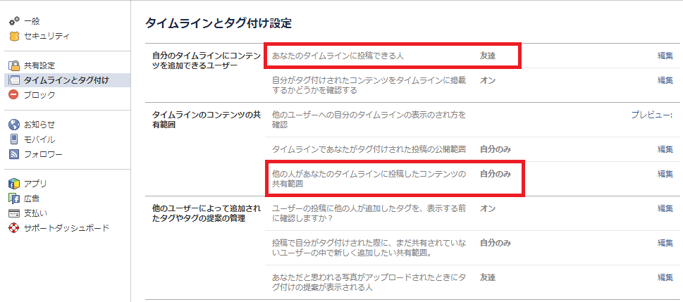 「あなたのタイムラインに投稿できる人」を「友達」に設定し、「他の人があなたのタイムラインに投稿したコンテンツの共有範囲」を「自分のみ」に設定します。