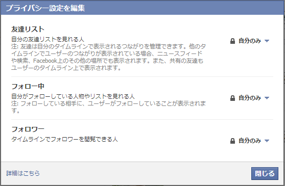 そうすると、タイムラインへの「友達」の投稿は許可しつつ、閲覧できるのは「自分のみ」となり、不適切な投稿が他人に見られることを防げます。