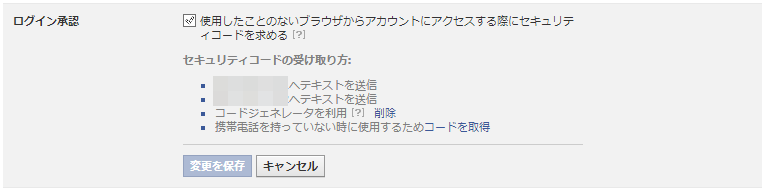 「歯車マーク」→「セキュリティ」のところにある「ログイン承認」は、「使用したことのないブラウザからアカウントにアクセスする際にセキュリティコードを求める」にチェックをします。これにより、自分が使用する機器以外からのログインができなくなります。