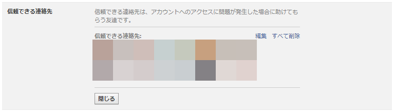 「歯車マーク」→「セキュリティ」のところにある「信頼できる連絡先」を登録します。万が一アカウントに問題が発生した時に協力を求めることができる人を3人以上5人まで登録できます。Facebook以外に連絡手段がある人でなければ意味がありません。