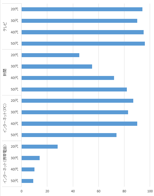 これも、テレビ・新聞・インターネットの世代別利用率をグラフにしました。