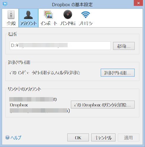 「アカウント」のところに「場所」の設定があります。その場所は、私がDropboxで使っているつもりの場所とは別の場所でした。