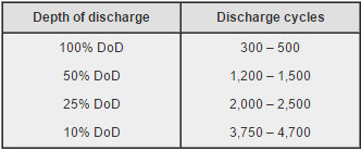 ここで参考になるのは、放電深度別の充電回数です。放電深度とは、二次電池の放電容量に対する放電量のことです。DoD(Depth of Discharge)とも呼ばれています。バッテリーを完全に使い切った状態が、放電深度100%です。