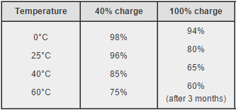 0℃では、1年たっても40%充電したうちの98%を保持し、100%充電したうちの94%を保持しています。60℃では、40%充電したうちの75%を保持しているのに対し、100%充電した場合には3ヶ月後に60%しか残らないという結果になっています。