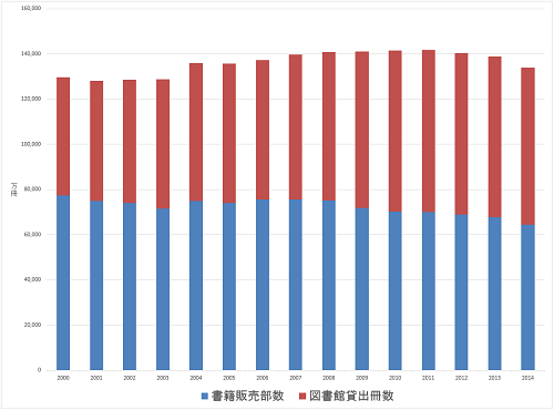 書籍販売部数と公立図書館の貸出冊数の合計は、2012年から少し下がり始めています。